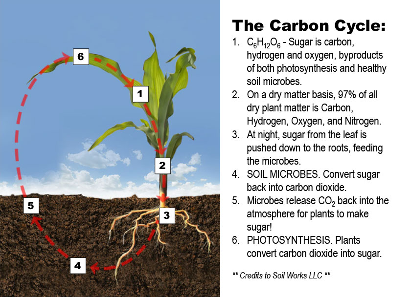 Once we have the environment and the soil life alive and well, we focus on building carbon. The carbon cycle is explained further on this website. Essentially, it is the corner post of life, and needed for quality in the plant, food for microbes, and resilience in the soil. Adopting farming practices to support the soil life and sequester and cycle carbon will increase soil health and efficiency.