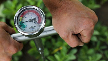 A Penetrometer is used to measure the compaction of the soil. Feeder or hair root penetration decreases linearly with penetration resistance, until almost no roots penetrate into soil with penetration resistance of 300 psi. Tap roots may penetrate the soil at higher psi. To check soil, push penetrometer vertically into the soil until the gauge reaches 300 psi. Reach down with your hand and grasp the penetrometer shaft level with the soil. Pull the penetrometer out to read the number of inches of aerobic zone.